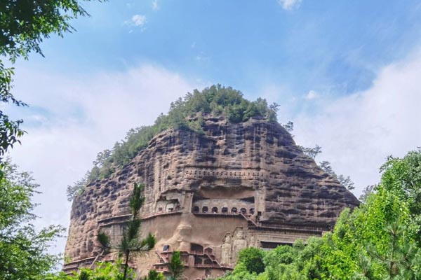 麦积山石窟位于秦岭西端北侧,距城区28公里。凿于十六国后秦时期,经北魏、西魏、北周、隋唐、五代、宋、元、明、清等10多个朝代的不断开凿、重修,遂成为仅次于敦煌莫高窟的我国第二大艺术宝窟,现存194个洞窟,泥塑、石雕7800多件,壁画1000多平方米,崖阁8座,以其精美的泥塑艺术闻名中外,被誉为“东方艺术雕塑馆”,是古丝绸之路上的一朵艺术奇葩,与敦煌莫高窟、山西云冈石窟、河南龙门石窟并称为中国四大石窟,而麦积山石窟则以独特的泥塑艺术独树一帜。
