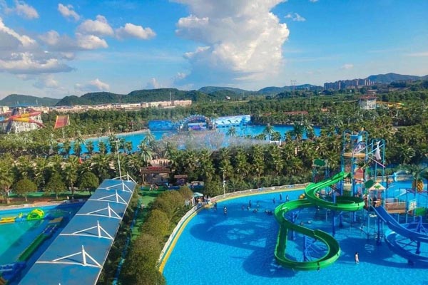 环流区有休闲水车群、无边界泳池、皮筏滑梯、螺旋滑梯、漂流河(环流河)等项目。其中皮筏滑梯是让游客坐在皮筏上,在波浪起伏的水面上高速滑行;漂流河(环流河)是中国国内最长的人工漂流河水道,蜿环绕整个室外水上乐园,游客可在浮圈上沿河源流,观赏沿途景观。