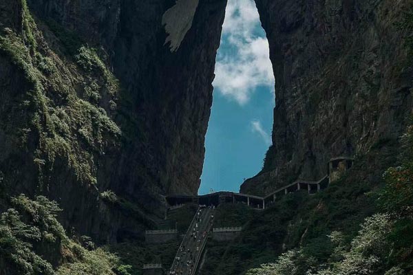 天门洞是世界最高海拔的天然穿山溶洞。三国吴永安六年(公元263年),嵩梁山千米峭壁轰然洞开,就像一座镶嵌在天幕上的通天之门,成为天下罕见奇景,嵩梁山亦由此改称天门山。