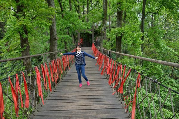 萧史弄玉,神仙眷侣,吹箫引凤,世所乐道,故此索桥名曰引凤桥。凤凰神鸟非梧桐不栖,桥侧挺立数十株梧桐,寓意栽得梧桐引凤来。桥全长80余米,索桥之下,修竹篁篁,幽深可观。索桥之上,可汲取天地灵气,畅饮山林清息。古树林列,人游画中,云缭雾绕,宛若遁入仙境。
