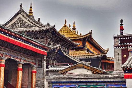 主要建筑依山傍塬,分布于莲花山的一沟两面坡上,有大金瓦寺、大经堂、弥勒殿、九间殿、花寺、小金瓦寺、居巴扎仓、丁科扎仓、曼巴扎仓、大拉浪、大厨房、如意宝塔等9300余间(座),组成一庞大的藏汉结合的建筑群,占地面积45万平方米。